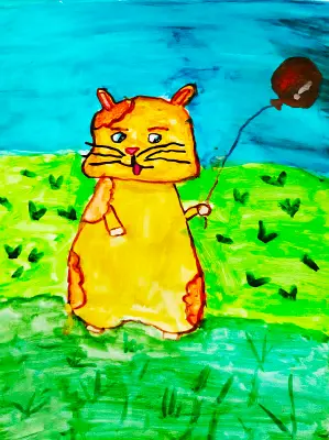 Илья решил нарисовать кота, который живет у него дома. Котик получился немного сказочный, он с воздушным шариком весело прогуливается по траве. Илья этим решил показать, что котика все любят, его никто не обижает, и что котик счастлив. Работа выполнена гуашью.