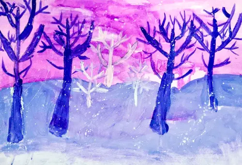 Виктория изобразила парк зимой, некоторые деревья словно окутаны снегом, а на горизонте, сквозь деревья, виден потрясающий закат. Виктория любит гулять в парке в любое время года, но именно красота зимнего парка произвела на девочку сильное впечатление. Работа выполнена гуашью.