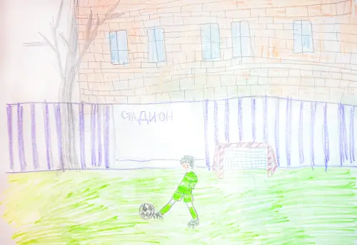 Я люблю играть в футбол и занимаюсь футболом уже три года. На картине я чеканю мяч на любимом стадионе, сегодня я решил рисовать акварельными карандашами, чтобы мой рисунок получился ярким и красивым.
