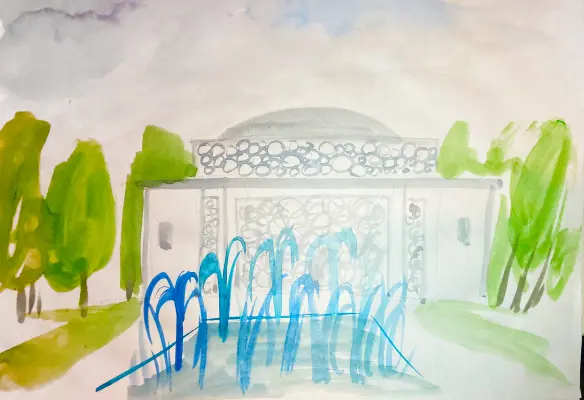 Я изобразила акварелью свой любимый парк Лужники, я очень люблю летом прогуляться у сухих фонтанов, покормить уточек и пройтись по набережной, а еще мы с папой часто ходим там на тренажеры