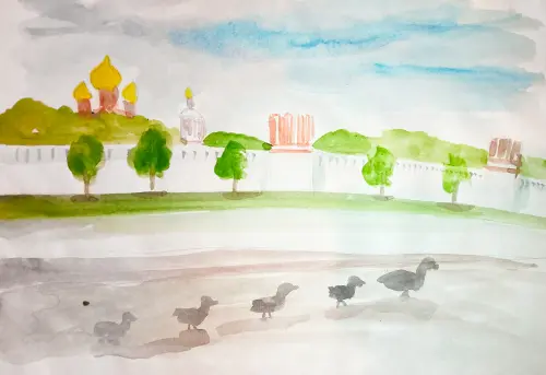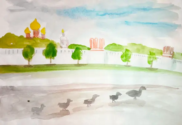 Я часто во время занятий бываю на пленэре у Новодевичьего монастыря. Я выбрала этот вид, так как совсем недавно занималась и рисовала акварельные наброски на летнем пленэре
