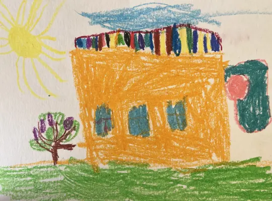 Саша пришла в Изостудию «Палитра» при ГБУК г.Москвы «ОКЦ ЦАО Дом культуры «Стимул» в апреле 2024 года. Саша нарисовала масляной пастелью дом во дворе рядом с Домом культуры. Саше понравился красный кирпич и большие окна дома. Крышу придумала сделать разноцветной, а над домом светит яркое солнышко!