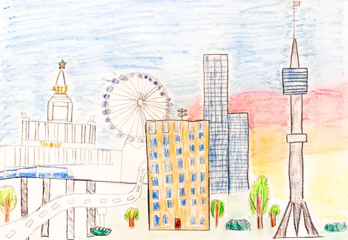 Я нарисовал вечер в Останкино, как вижу его я. Это самый лучший район в моём городе, ведь здесь есть огромное колесо обозрения, Останкинская башня, Ботанический сад, Останкинский пруд, а по соседству расположен ВДНХ со множеством развлечений, и много чего ещё! В моём районе строятся новые жилые комплексы, открываются магазины и кафе. Здесь есть метро, удобные автобусные остановки, велосипедные дорожки и много пешеходных маршрутов. Обожаю гулять с родителями по нашему району! А какие у нас закаты... Приглашаю всех москвичей и гостей столицы приехать в мой район и полюбоваться красотой любимого Останкино.