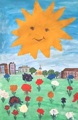 Я живу в самом чистом и зелёном районе Москвы, который называется Тёплый стан. Недалеко от моего детского сада и дома находится зона отдыха Тропарево. Я там очень часто гуляю, играю, катаюсь на пони. Поэтому нарисовать захотелось любимую полянку с цветочками, солнышком и домами вдалеке. С моими друзьями и родителями на полянке устраиваем пикник и играем. Свой район и двор я очень люблю.
