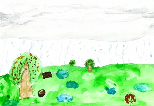 Редкие бело-серые и тяжёлые облака. Надвигается грозно-синяя туча, усиливаются порывы ветра, уже вдали грохочет гром. Вслед за редкими крупными каплями дождя становится темно — туча закрыла постепенно и быстро всё небо. И вот уже молнии и частые раскаты грома, и как из ведра льётся дробный и тяжёлый дождь.