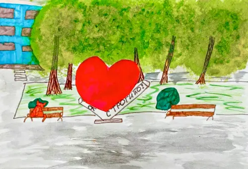 Я люблю свой район Строгино! Самый зеленый, живописный и уютный район Москвы. Я нарисовал парк, виднеется школа. На скамейке сидит кот. Я очень люблю животных.