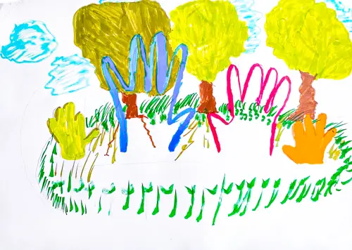Моя картина посвящена моему любимому парку, в котором раньше на центральной площади располагалась конструкция из 4-х ладошек, которые символизировали семью. Мы часто гуляем там всей семьёй по садовым дорожкам среди огромных деревьев, катаемся на роликах и велосипедах.