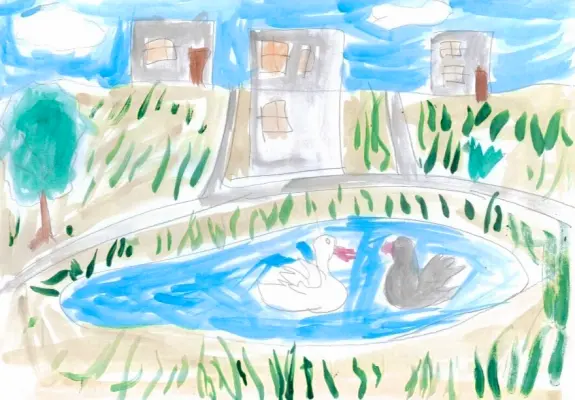 На этом рисунке изображен пруд в пойме реки, на который мы часто ходим с мамой и папой. В центре нарисовано озеро, в котором плавают две утки — одна белая, а другая серая, мы часто кормим таких же уточек. Вокруг озера растёт зелёная трава и деревья. На заднем плане видны три домика с окнами, в которых по вечерам горит свет. Небо голубое с белыми облаками, а дорожка ведёт к домикам. Всё выглядит очень уютно и весело, мне нравится жить в моем районе!