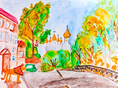 Рисунок выполнен акварельными красками. На рисунке Даниил изобразил аллею в 1-м микрорайоне вдоль Пятницкого шоссе, которая ведёт к нашему большому и очень красивому храму.