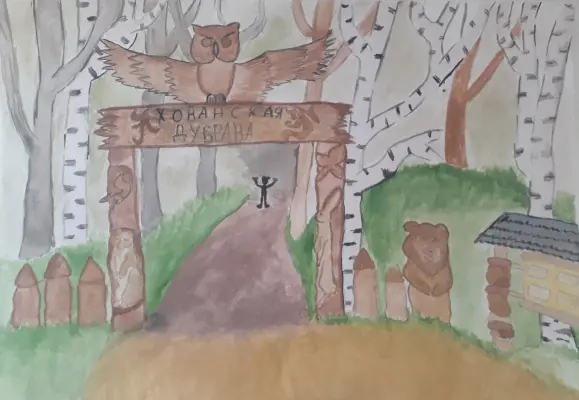В своей работе я хочу передать атмосферу сказки, которая есть в этом парке и отражается в деревянных конструкциях, в которых вырезаны фигуры птиц и животных, загадочная, сначала даже немного устрашающая тропинка, окружённая огромными деревьями — всё это погружает тебя в сказку, в которой обязательно будет счастливый конец)