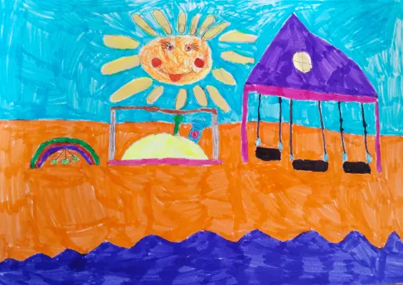 Я живу в микрорайоне "Южный", тут красивые дворы и площадки. Это соседний двор, где живёт моя подруга Варя, я люблю с ней качаться на качелях, бегать и играть. Я нарисовала солнечный день, большую песочницу, карусель и качели. Очень люблю гулять в наших дворах.