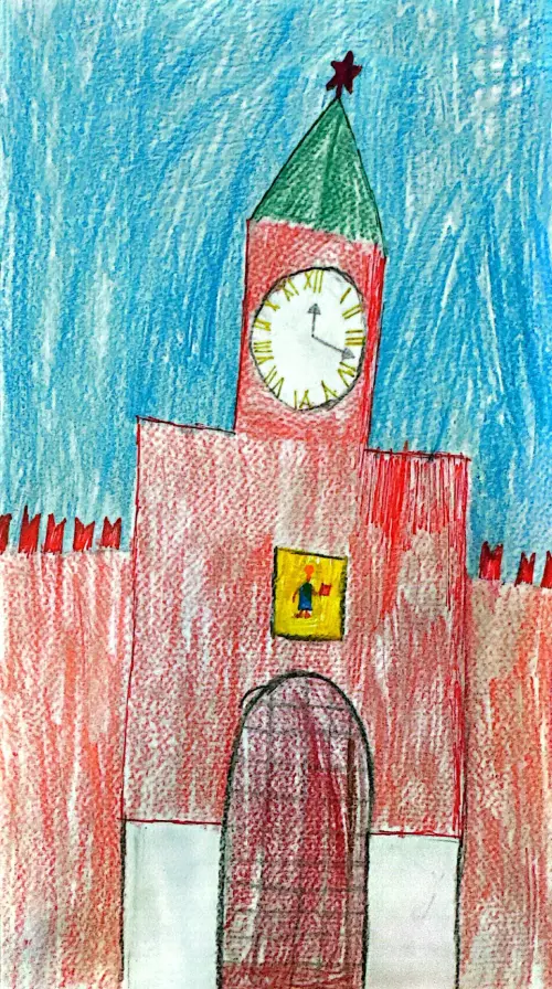 На рисунке изображен Московский Кремль - уникальное и самое известное сооружение в мире! Для рисования использовались обычные цветные карандаши, но, для большего контраста, в некоторых местах использовалась ручка красного цвета.