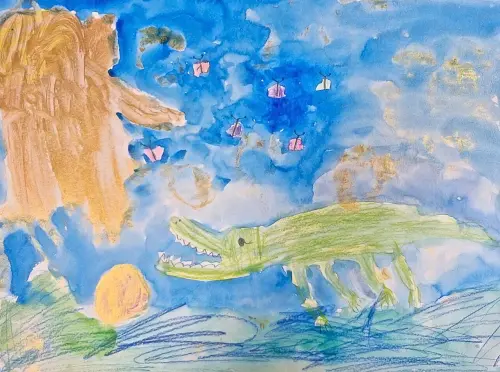 Элина живет совсем рядом с зоопарком. Однажды девочка с классом была на экскурсии и увидела большого крокодила. Он очень поразил Элину, имено поэтому она решила запечатлеть его на рисунке.