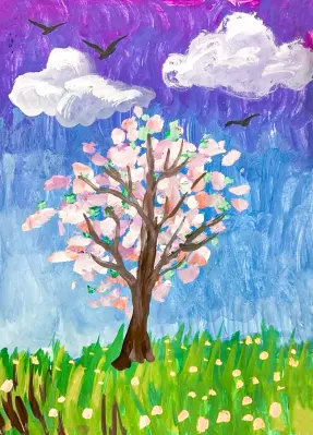 Работа нарисована гуашью и отображает цветение яблони в нашем микро-парке. В центре композиции — высокая и стройная яблоня с раскидистой кроной, покрытой множеством белых и нежно-розовых цветов. Цветы выглядят пышными и свежими, создавая ощущение весенней свежести и пробуждения природы. Вокруг дерева видны зеленые листья и травянистая подстилка, а на заднем плане — мягкое голубое небо с легкими облаками. Общая атмосфера рисунка передает красоту и гармонию весеннего сада, напоминая о наступлении теплых дней и пробуждении природы в нашем районе.