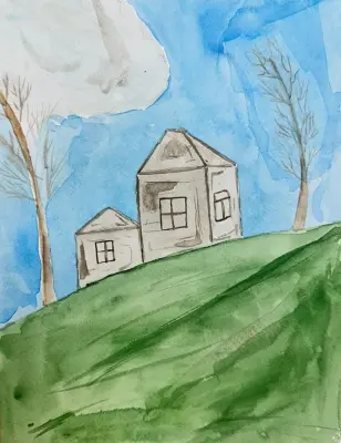 На рисунке изображены два дома, расположенные на улице Малая Филёвская. Первый дом — высокий и просторный, с ярко-серой кирпичной кладкой и чёрными оконными рамами. Его фасад крепок, а на крыше обложен черепицей. Второй дом — чуть ниже и скромнее по размеру, выполнен в светлых тонах с простыми окнами и крышей. Между домами протянута узкая улица с зеленью, по которой идут пешеходы. Вокруг — деревья и кустарники, создающие уютную городскую атмосферу. Общий настрой рисунка передаёт атмосферу спокойного городского утра или вечера в столице.