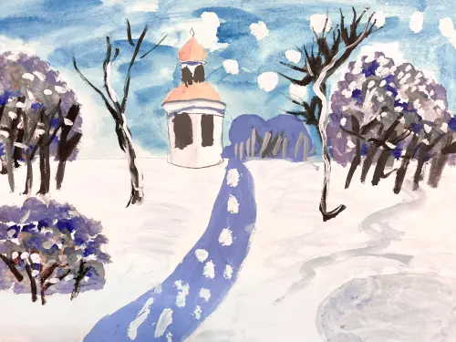 Я нарисовала парк у дома. На рисунке можно увидеть дорожку, ведущую в лес, деревья, кусты и церковь. Я очень часто провожу время в этом парке, гуляю с друзьями или родителями.