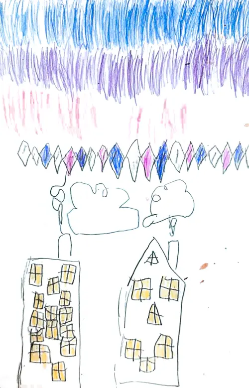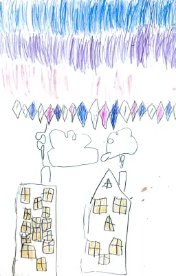 На рисунке изображена панорама района Фили-Давыдково на Кастанаевской улице в Москве. В центре композиции — многоэтажные жилые дома, выполненные в современном стиле с яркими фасадами и большими окнами. На фоне — великолепный закат: небо окрашено в теплые оттенки оранжевого, розового и пурпурного, плавно переходящие друг в друга. Солнце уже почти за горизонтом, его мягкий свет заливает здания и создает длинные тени. В целом, рисунок передает атмосферу спокойного вечера в районе Фили-Давыдково, когда город постепенно погружается в тишину и уют закатного времени.