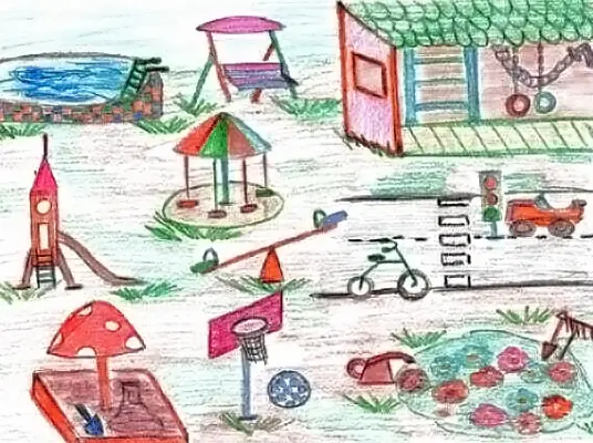 Игровая площадка возле детского сада в Москве, рисунок выполнен карандашами и мелками.