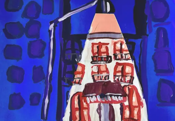 На этой работе изображен мой любимый дом! Он красив, особенно ночью, когда все вокруг темное, фонарь освещает дом и он светится! Я очень люблю свой район, потому что у нас красивые дома и улицы, много парков и скверов, где весело гулять!