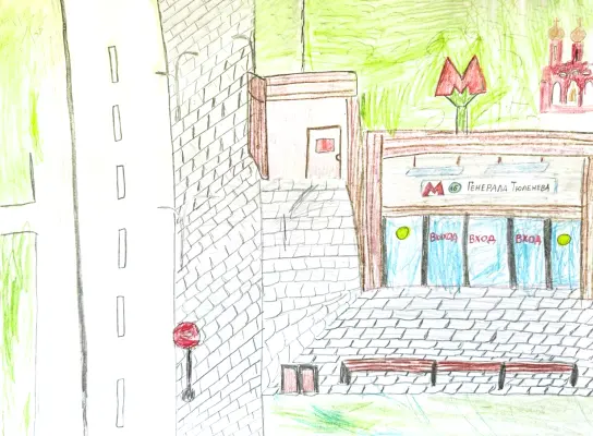 На этой яркой и насыщенной картине изображен мой любимый район. Слева — мой дом, где я живу и чувствую себя в безопасности. Рядом стоит красивая церковь с золотыми куполами, которая украшает наш район и наполняет его добротой. А рядом с ней находится лес, в котором мы часто гуляем с родителями. В середине проложено метро, по которому я часто езжу в гости к своим родственникам, друзьям или на прогулки. Эта картина показывает, как разные места вместе создают уютный и интересный район, в котором я люблю расти и играть.