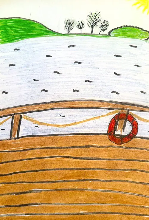 На рисунке изображен пирс, расположенный на Мазиловском пруду в районе Фили-Давыдково. В центре композиции — деревянный пирс, выступающий в спокойные воды пруда. Он состоит из нескольких досок и опор, создающих уютную и немного романтичную атмосферу. На берегу видны зеленые деревья и кустарники, которые обрамляют пруд и придают природе естественный вид.