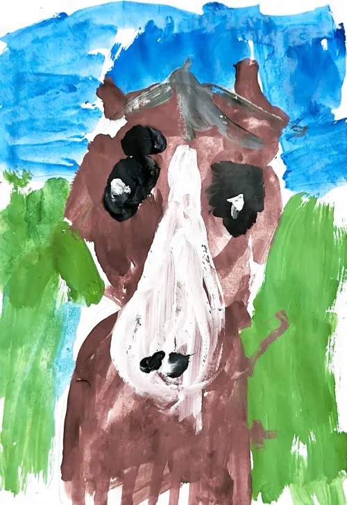 Я нарисовала лошадку! Она такая красивая, с большими чёрными глазами и белой полоской на носу. Я использовала коричневую краску, чтобы сделать её тело, а потом добавила зелёную траву вокруг, чтобы она стояла на лугу. А небо я сделала синим, чтобы было похоже на солнечный день. Мне кажется, лошадка получилась очень доброй и весёлой!