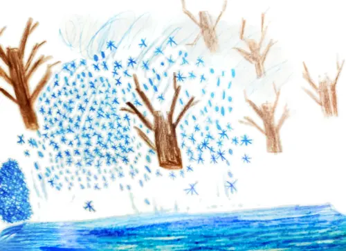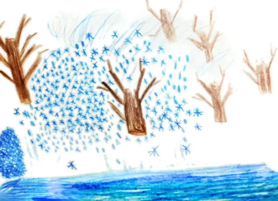 Больше всего я люблю зиму, зимой я катаюсь на лыжах и коньках. Я нарисовал зиму в моем дворе, у нас под окном много деревьев, которые зимой полностью накрыты снегом.