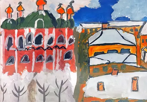Москва. Вид на улицу Варварка и собор иконы Божией Матери «Знамение» из природно-ландшафтного парка «Зарядье». Работа выполнена гуашью. Ребёнок занимается в изо-студии «Гармония».