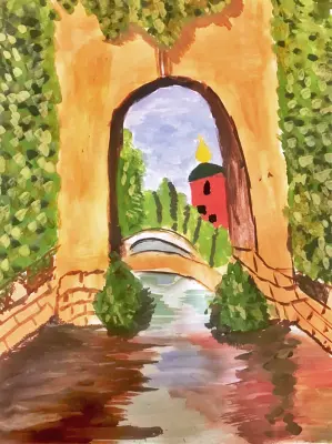 Красивый живописный старинный мост через речку Яузу летним днём. Рисунок выполнен гуашью. Студия "Гармония", руководитель изо-студии Цветкова Елена Евгеньевна.