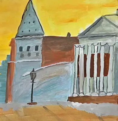 На рисунке изображена Манежная площадь с видом на Манеж на фоне вечернего заката. Выполнение работы гуашью. Изо-студия "Гармония". Руководитель Цветкова Елена.