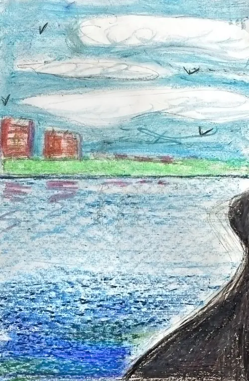 На моей картине берег Гольяновского пруда. Я нарисовала так, чтобы было видно и берег, и воду, и дома вдали. С этого места открывается очень красивый вид на мой район.
