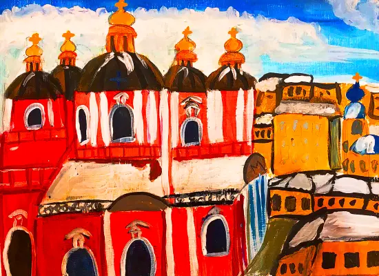 На рисунке изображен Собор иконы Божьей Матери Знамение бывшего Знаменского монастыря, улица Варварка. Работа выполнялась гуашью. Изостудия Гармония.