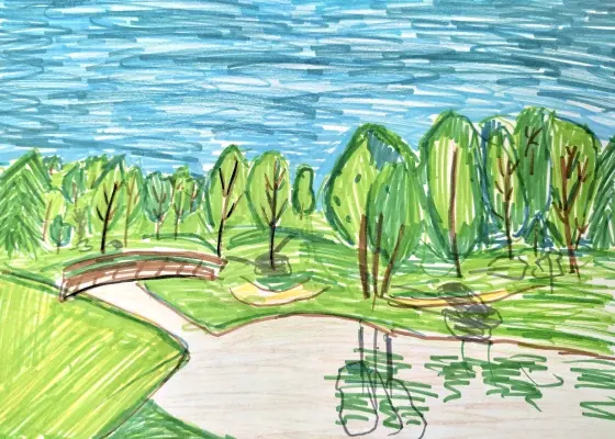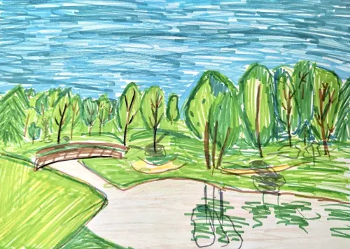 Я нарисовала Бабаевский пруд в моём районе Гольяново. Рядом с ним есть парк, я люблю там гулять. В хорошую погоду деревья отражаются в воде, я постаралась изобразить это на своём рисунке.