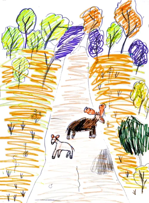 Я нарисовал лосей, потому что я знаю, что они иногда встречаются в моём районе. Они живут недалеко - в "Лосином острове". Это очень красивые животные с большими рогами, я очень хотел бы их увидеть.