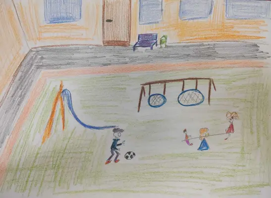 На картине изображен уютный двор, где можно увидеть дома, деревья и цветы, качели-гнездо и качели для двоих. Мальчик играет в мяч.