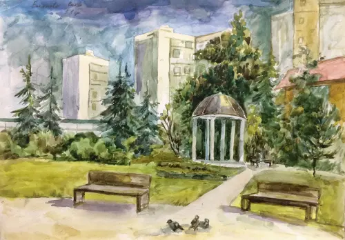 На работе изображена ротонда, расположенная в парке в 16 микрорайоне Зеленограда. Одно из любимых мест жителей Зеленограда: в ней можно спрятаться от палящего солнца, от дождя, а художникам одно удовольствие ее нарисовать.