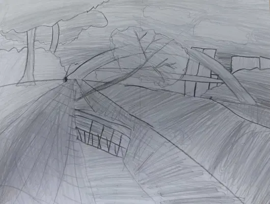 Черкизовский пруд. Работа выполнена простым карандашом. На картине изображен пешеходный мост, соединяющий Черкизовский парк и Щитову набережную.