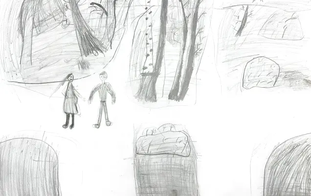 Я нарисовал как мама и папа гуляют в районе Гольяново. Наш район очень красивый, мы часто выходим на прогулки, есть парк, лес и озеро. В лесу можно встретить разных животных.