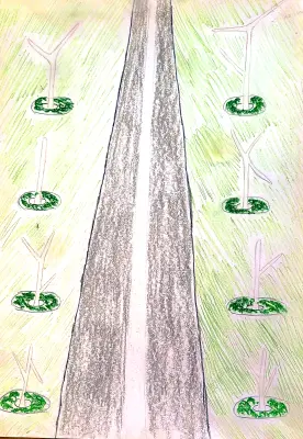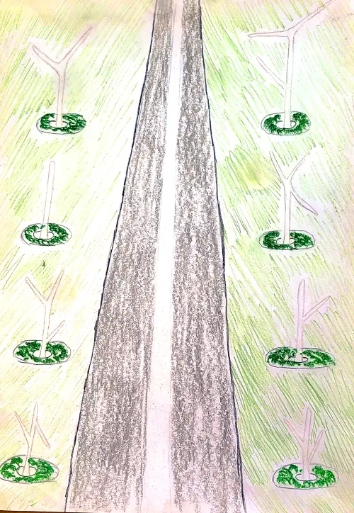 Я нарисовала дорогу, по которой мы едем домой. С двух сторон посажены и растут молодые деревья.