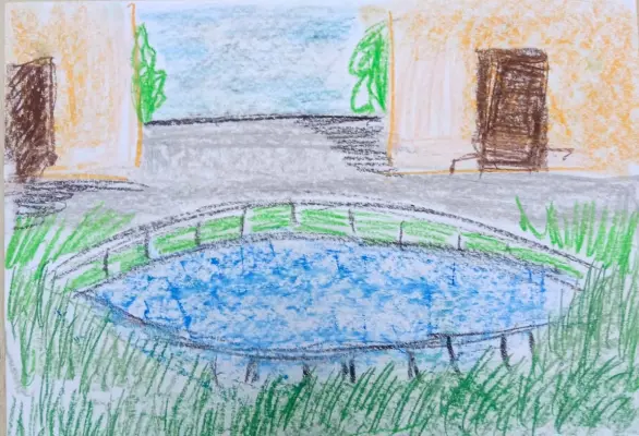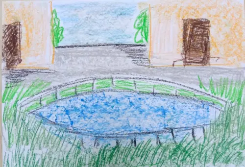 Тут нарисован пруд, в котором плавают утки, рыбаки ловят рыбу, рядом с прудом есть сцена на которой сейчас летом проводятся мастер классы для детей, включают колонку с музыкой.