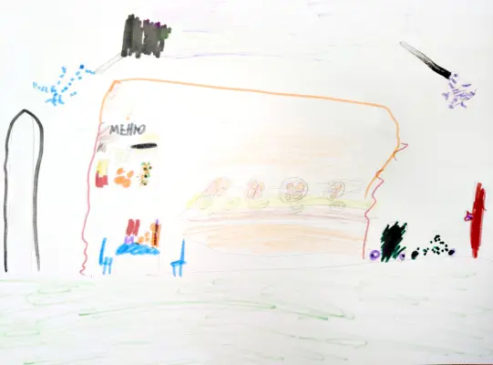 Я нарисовала моё любимое место в районе Гольяново - кафе "Вкусно и Точка". Я очень люблю туда ходить с мамой или с друзьями, есть картошку-фри и мороженое.