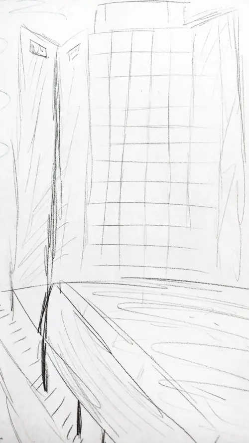 Нарисовала место папиной работы. Я бываю часто у него и гуляю рядом с фонтаном, в котором иногда я купаюсь. В здании, которое я нарисовала, есть вертолётная площадка, но я там не была.