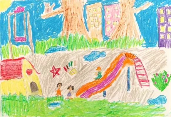 Что у нас во дворе? Мой дом! Мой дом будто живой. Когда я выхожу во двор и смотрю на него снизу вверх мне так и хочется сказать, что это великан. Мы играем во дворе, а он молча следит за нами. Очень приятно иметь друга великана! Мой дом — мой друг. У нас во дворе есть волшебная горка. Она очень похожа на горку в аквапарке. А еще у нас во дворе есть сказочный домик. Когда там играют малыши, то кажется, что это маленькие гномики