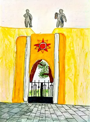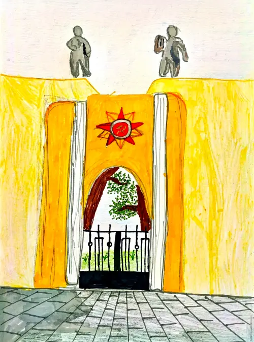 На листе бумаги красуются ворота. Не просто ворота, а настоящие врата в сказку! Они высокие, величественные, словно вход в волшебный замок. Наверное, их строили великаны, потому что они такие огромные! А за ними наш брошенный Восточный сад.