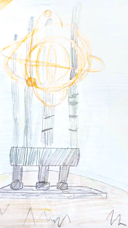 Нарисовать природу мне не хотелось. Поэтому рисую большой памятник атому, который стоит у нас в городе. Город наш научный, даже есть свой институт и много заводов.