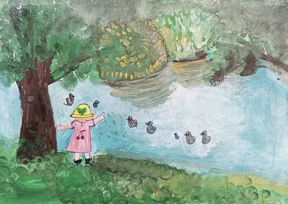 Рисунок "Исаковский пруд" выполнен в технике работы гуашью. На рисунке изображён пруд в деревне Исаково, Краснопахорского района. Рисунок вызывает у зрителя чувство ностальгии и желание оказаться вместе с этой маленькой девочкой на берегу этого тихого пруда, наслаждаясь свежим воздухом и пением птиц. Он является прекрасным примером того, как простыми средствами можно создать запоминающийся и трогательный образ родного края.