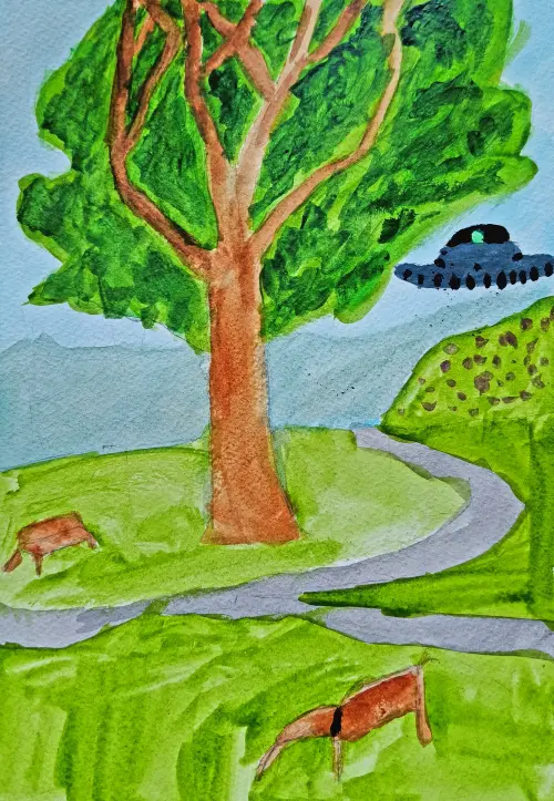 В парке Тропарево-Никулино есть поляна с дубами и красивыми цветами. Рано утром, прилетела тарелка с иноплпнетянинами за цветочками. Но они улетают, потому что им мешает дуб-защитник.