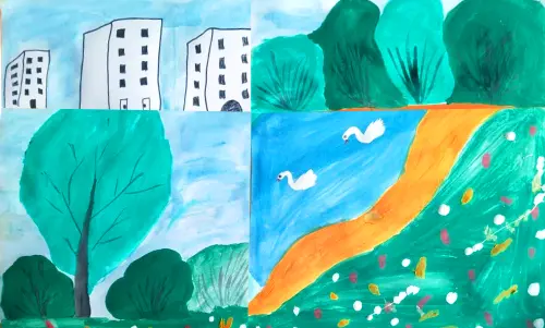 В своём рисунке я показал разные места, которые мне нравятся в родном городе. Это и дома, и парки с высокими деревьями и прудами, в которых плавают уточки, а иногда и лебеди.