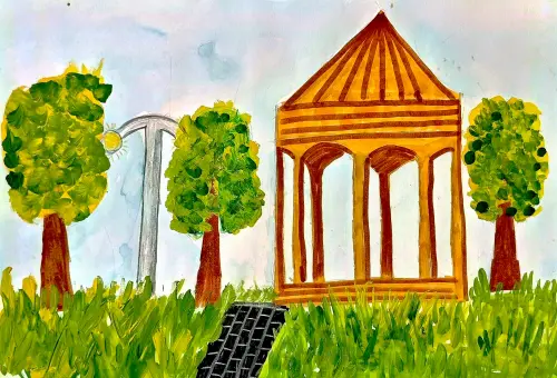На моем рисунке оживает кусочек летнего парка! В центре внимания – уютная беседка, словно сошедшая со страниц сказки. Расположенная в моем районе. К беседке ведет аккуратная дорожка, выложенная черными кирпичиками. Каждый кирпичик старательно прорисован, и кажется, что по этой дорожке можно прямо сейчас отправиться на прогулку по любимому району.