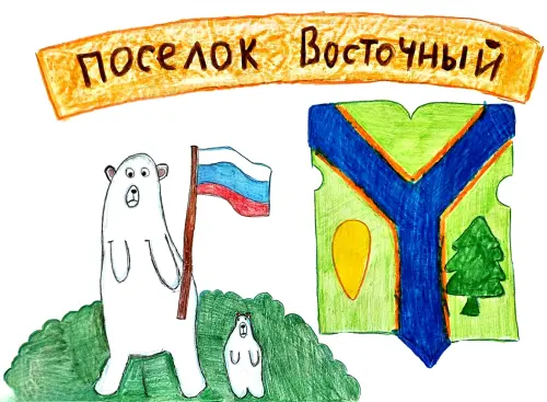 Над гербом крупными буквами, как на ленте, выведена надпись: "Поселок Восточный". Чувствуется, гордость за место, где живу, и хочется поделиться этой гордостью со всем миром.